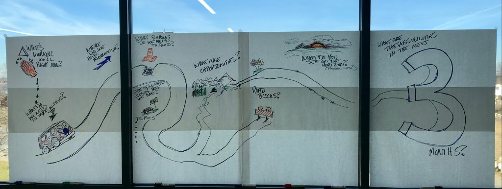 After the team finished, we stepped back and looked at the big picture of our collective answers. Then we themed the answers. Those themes helped guide the next steps in creating our strategic plan for the next 3 months.